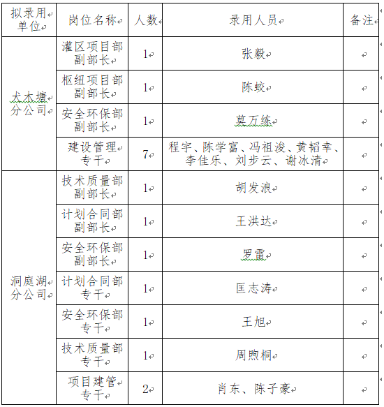 根据《湖南省水利发展投资有限公司2022年对外公开招聘公告》有关规定,经初步筛选、面试、背景调查、体检等程序。确定拟录用人员,现公示如下: