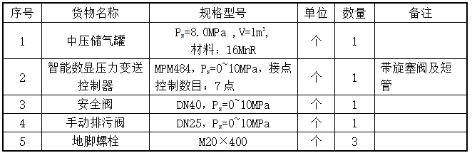 1.5采购项目概况:湖南省南津渡水电站设有中压压缩空气系统,该系统向调速系统油压装置供气,经减压后供机组制动用气。该系统设置二台活塞式空压机,二个中压储气罐。其中一个中压储气罐于1989年生产,已投运33年,超过使用年限,本次拟进行更换,供应商可自行实地考察。